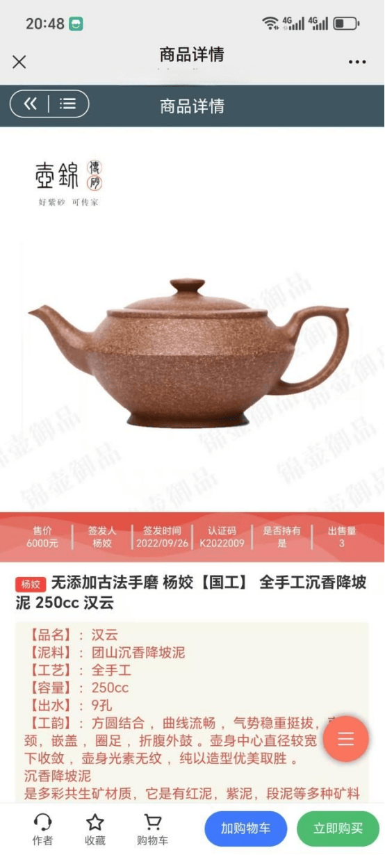 紫砂壶的收藏价值源于其稀缺性、工艺性与文化性,但传统鉴定方式依赖经验,易被仿制者钻空子。锦壶御品率先将区块链技术引入紫砂领域,为每把壶生成独一无二的电子标识——数字身份证。通过加密算法,壶的原料产地、制作工艺、匠人信息、流转记录等关键数据被永久存储于区块链上,形成不可篡改的“数字档案”。消费者只需通过平台认证绑定,即可实时查询壶的“全生命周期”信息,实现从原料到成品的全程溯源。