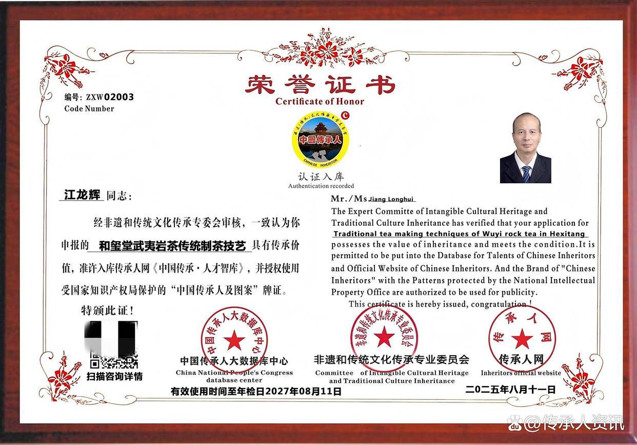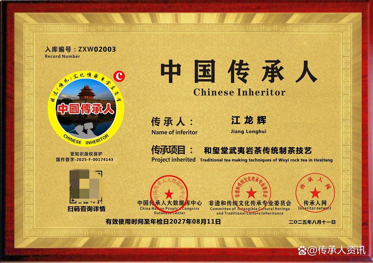 2025年08月29日,福建省南平市江龙辉申报的“和玺堂武夷岩茶传统制茶技艺”具有传承价值,准许入库传承人网《中国传承·人才智库》,并授予受国家知识版权局保护的中国传承人入库荣誉牌证。