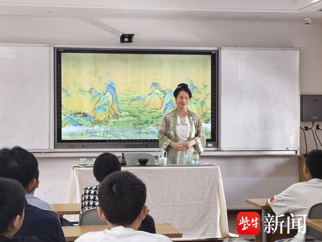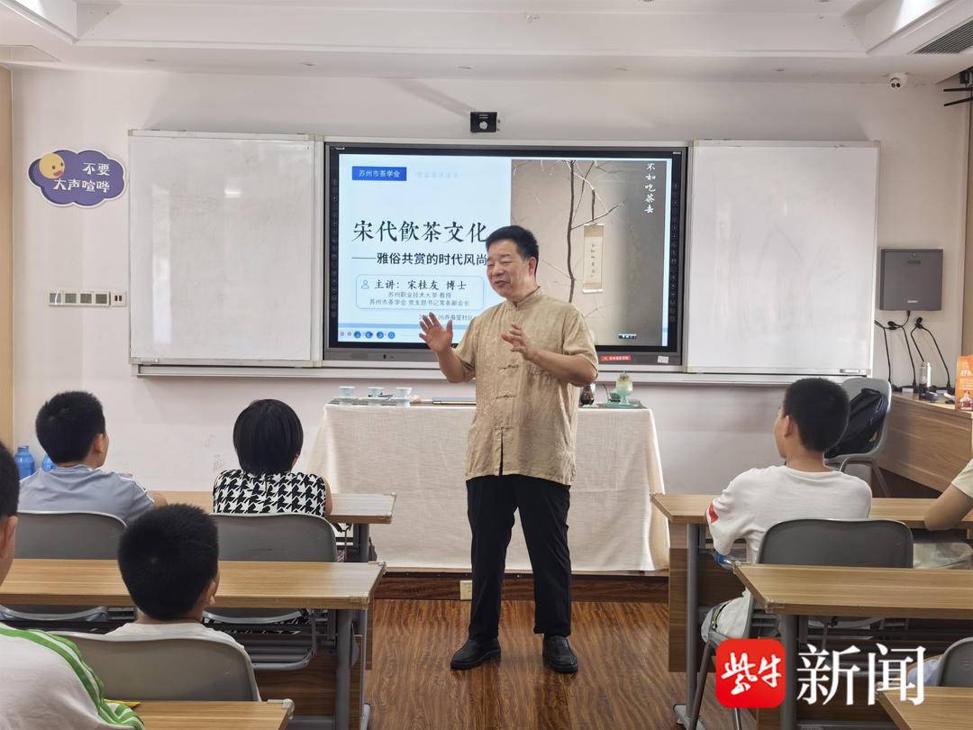 此次活动特邀苏州职业技术大学教授、苏州市茶学会副会长宋桂友博士,以及宋代点茶非遗传承人彭克荣弟子、专业茶艺师张慧老师联合参与,分别负责茶文化授课与点茶技艺指导。宋桂友博士以“茶史千年”为主题,从“神农尝百草”的传说引入,生动讲述唐宋时期茶道的繁荣盛况,借助丰富的历史典故与趣味故事,系统梳理中国茶叶的起源、发展和历代饮茶风俗的变迁。孩子们听得津津有味,在轻松愉快的氛围中拓展了对传统茶文化的认知。
