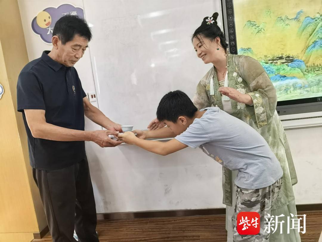 体验环节结束后,在张慧老师的带领下,孩子们专注学习敬茶礼仪,随后双手捧起自己亲手点制的茶汤,依古礼向父母敬茶并行揖礼。温馨与庄重交织的氛围中,青少年们通过这极具仪式感的敬茶之礼,感受“孝亲敬长”这一中华传统美德的价值与意义。