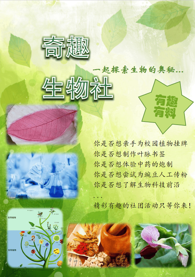 为了拓展同学们的生物视野,为爱好生物的同学们提供一个学习和实践的平台,奇趣生物社为同学们准备了丰富而精彩的社团活动,包括为校园植物挂牌、制作叶脉书签、体验中药炮制、为豌豆人工传粉、聆听生物科技前沿讲座等。